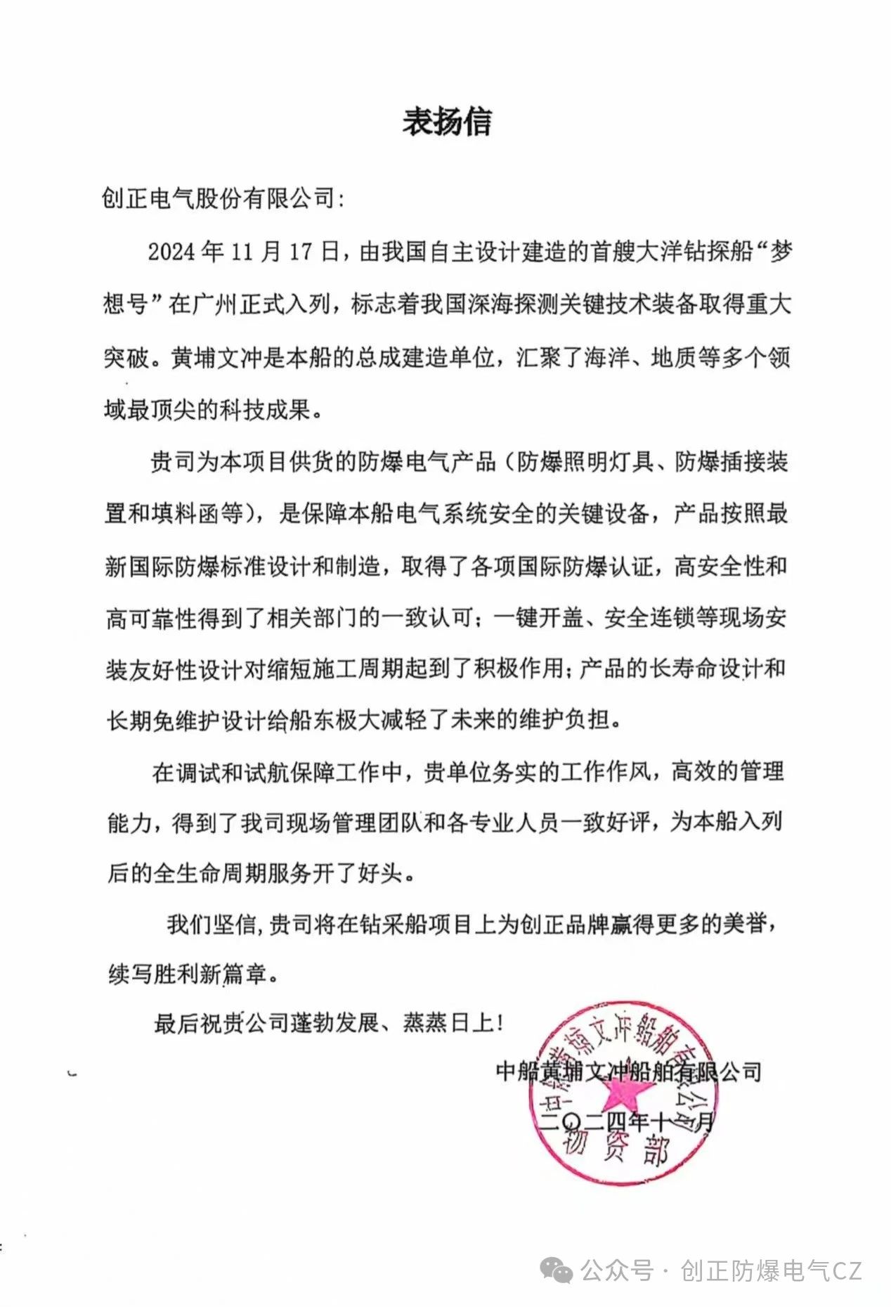 梦想”号海试成功并正式入列,中船黄埔文冲船舶有限公司物资部向我司发来感谢信,在“梦想”号建设过程中,对钱柜QG777电气提供的高安全性和高可靠性的防爆电气产品以及专业高效服务能力表示好评。